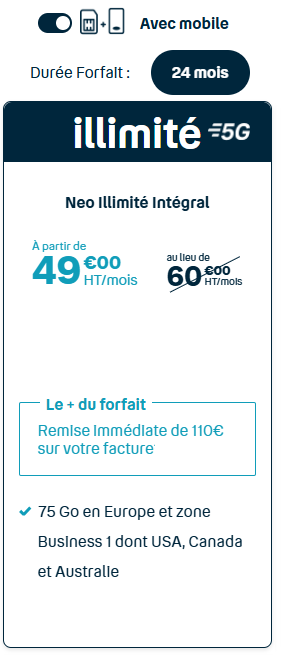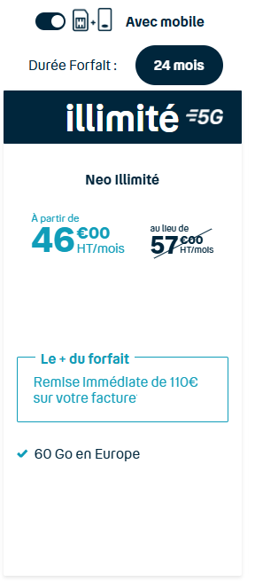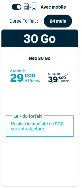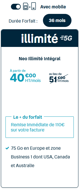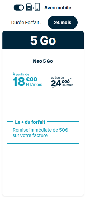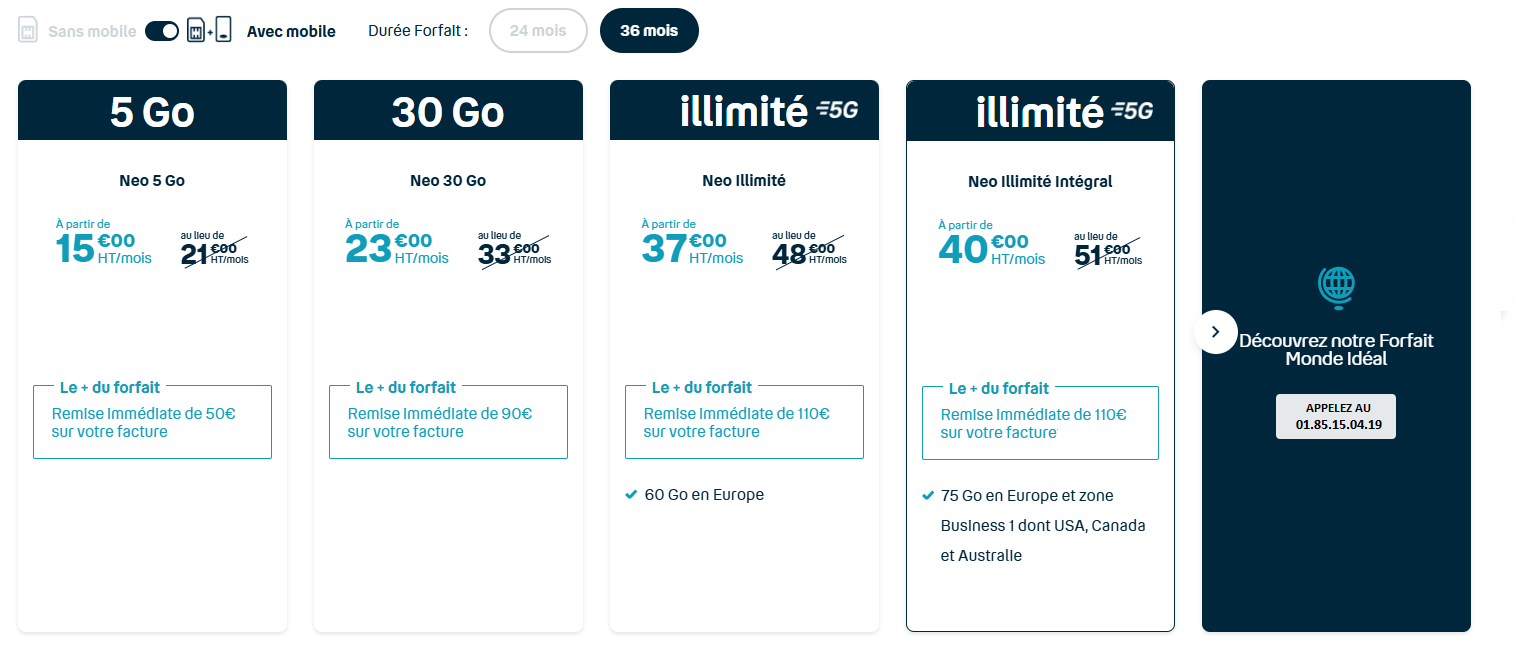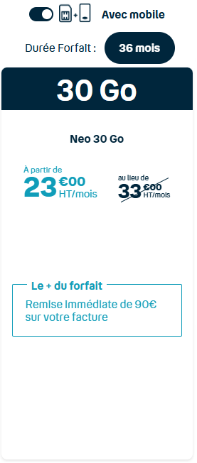 À partir de : 17€ HT Si vous préférez une totale liberté, nos forfaits sans engagement sont faits pour vous. Pas de contrat à long terme, changez de forfait quand vous le souhaitez, sans frais de résiliation. Idéal pour ceux qui recherchent de la flexibilité et qui préfèrent adapter leur consommation au fil du temps.